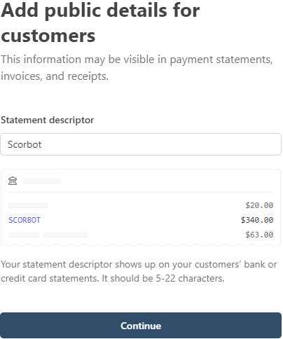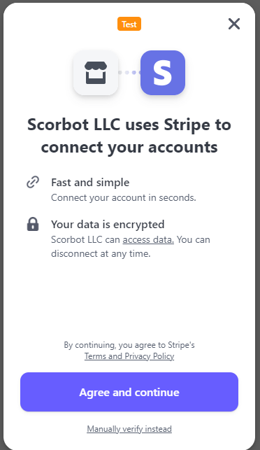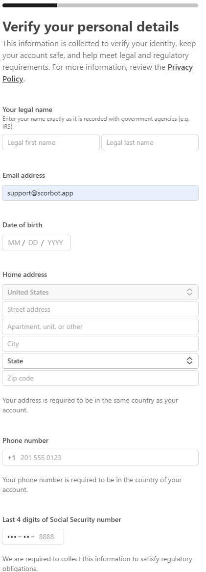 - Note: Even if you already have a Stripe account, you need to set up a new Stripe account through Scorbots platform. This is essential for successful payouts.