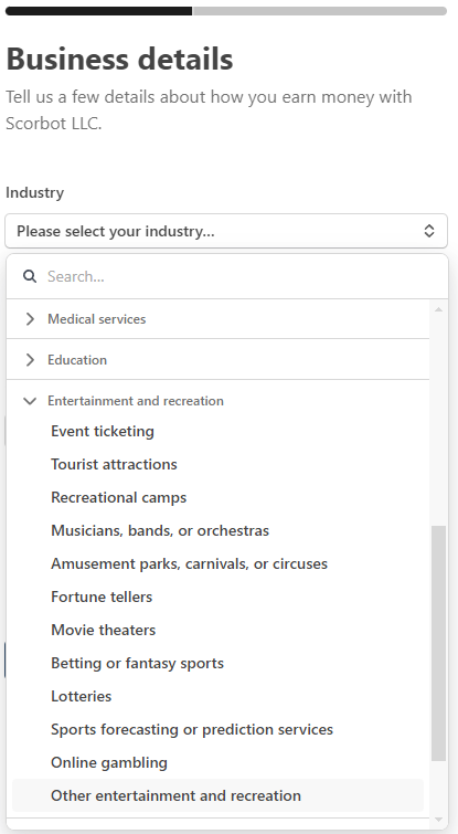 - Fill in the necessary information about your business. Consider selecting "Other entertainment and recreation" under the "Entertainment and Recreation" tab.