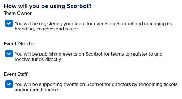 - Ensure your role is selected as Event Director, Event Staff, or Organization Owner, or Team Owner within Scorbot.
