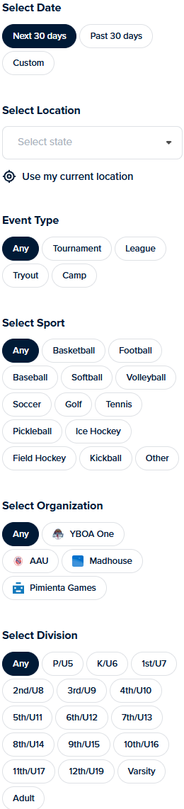 2. Input any search criteria that you have for your event. If you do not input any search criteria, this will automatically filter to any events in the next 30 days, in any state, any event type, any sport type, within any organization, any division, and any gender:
